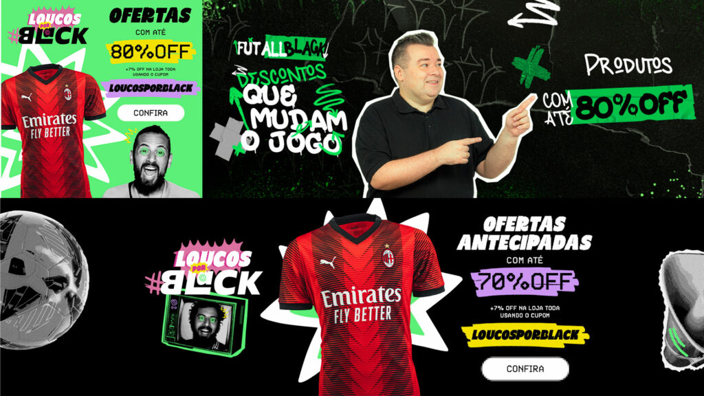 Todo ano, a Futfanatics faz campanhas históricas que marcam o calendário do varejo. Para a Black Friday, uma das campanhas mais lembradas é a “Loucos por Black”, que já trouxe a irreverência do Cartolouco que invadiu o estoque da nossa loja, gerando conteúdo de alta qualidade e muitas ofertas para nossos clientes.