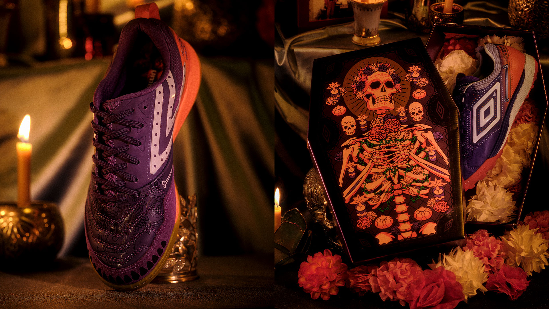 Em vez de tristeza, a data é marcada por flores, caveiras coloridas, velas e muita arte. Um verdadeiro tributo à vida e à memória. E é justamente esse espírito vibrante que inspirou a nova Chuteira Umbro Pro 5 Bump.